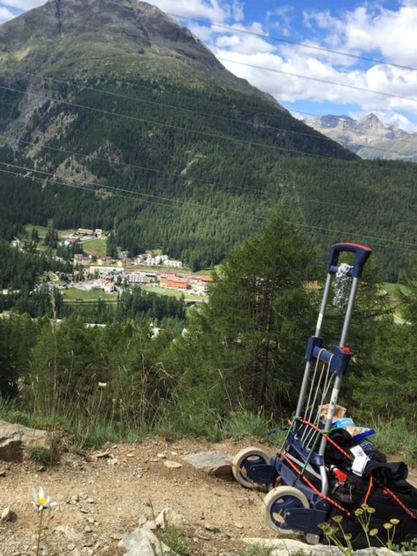 Dieses mal in der Schweiz (nahe St. Moritz) sollte ich einen Berg hoch und dachte dort gäbe es eine Seilbahn. Dies stimmte leider nicht und so musste ich über 400 höhen Meter und knapp 2 km selbst überwinden. Da ich über 30 kg Gepäck dabei hatte, habe ich euren Wagen genommen. Die ersten 200 Meter Weg auf einer Schotterpiste waren noch sehr angenehm, dann kam leider der kleine Wanderweg zum Berg hoch und es wurde es sehr eng und schwierig. Jedoch war eure Sackkarre eine große Hilfe, auch wenn ein richtiger Rucksack angebrachter gewesen wäre. Zudem muss ich sagen, auf dem Gelände was sehr viele Steine, Stufen etc. hatte, hat Euer Wagen das super ausgehalten, keine Schäden, gar nichts!